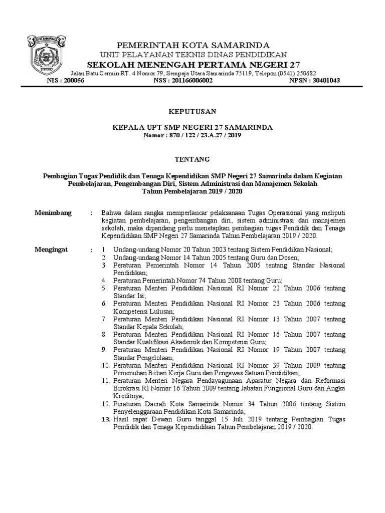 200/viii sungai karang semester 1 (ganjil) tahun pelajaran 2017/2018 Pembagian tugas mengajar dan tugas tambahan pada guru sd islam yaqin 3 sungkun pada semester 1 (ganjil) tahun pelajaran . Dalam pelaksanaan tugas guru diperlukan adanya sk pembagian tugas mengajar bagi guru yang dibuat oleh kepala sekolah sebagai dasar pelaksanaan tugas . Surat keputusan ini akan menjadi salah . Pendidikan dan untuk memperlancar tugas sebagai guru maka sangat perlu ptk dibuatkan surat keputusan pembagian tugas.